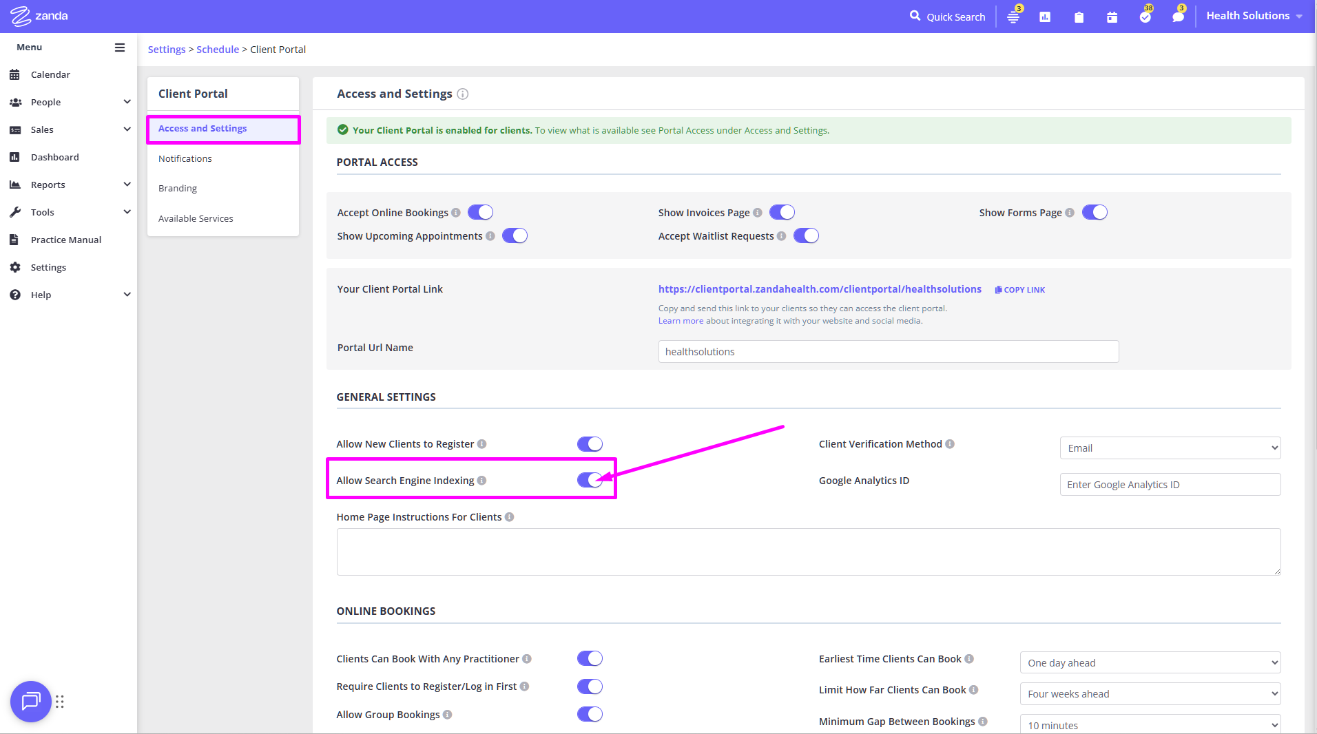 Privacy Note: Enabling Allow Search Engine Indexing setting makes your Client Portal address and public information visible in web search results.