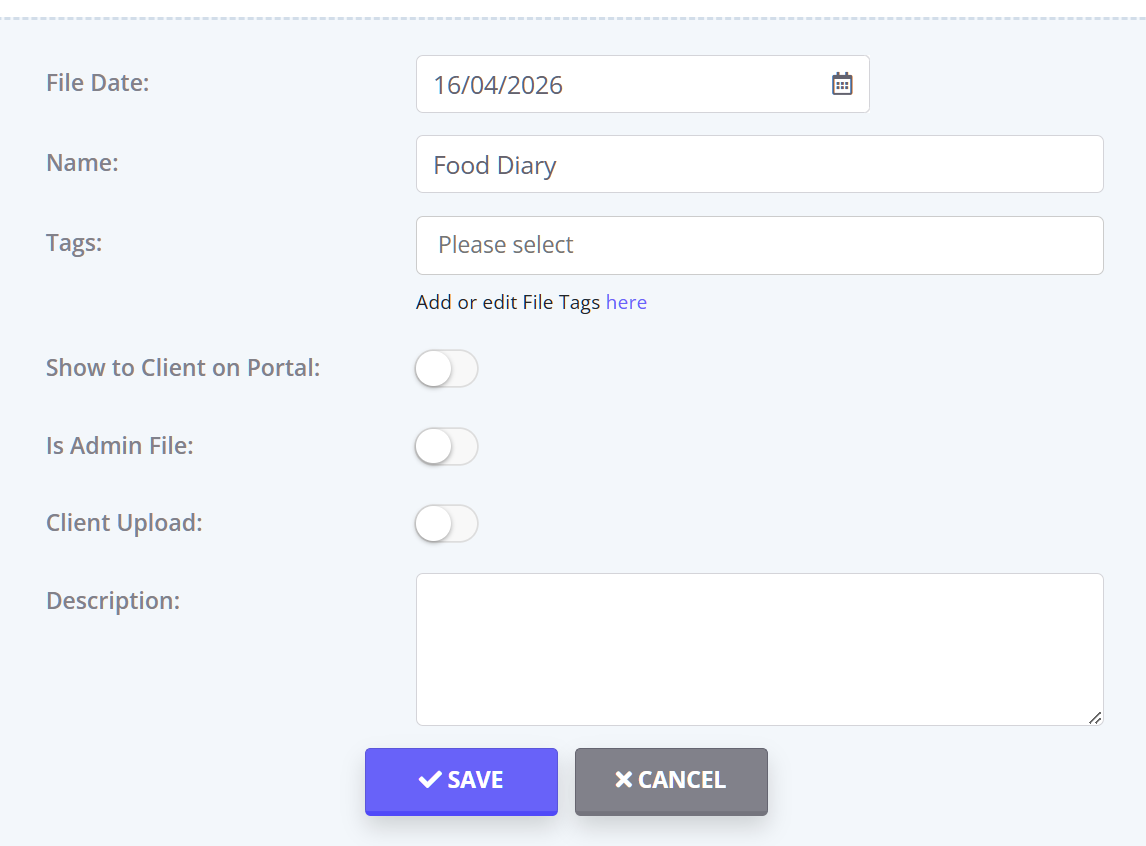 Files uploaded by clients are clinical by default. You can switch on Is Admin File if needed.