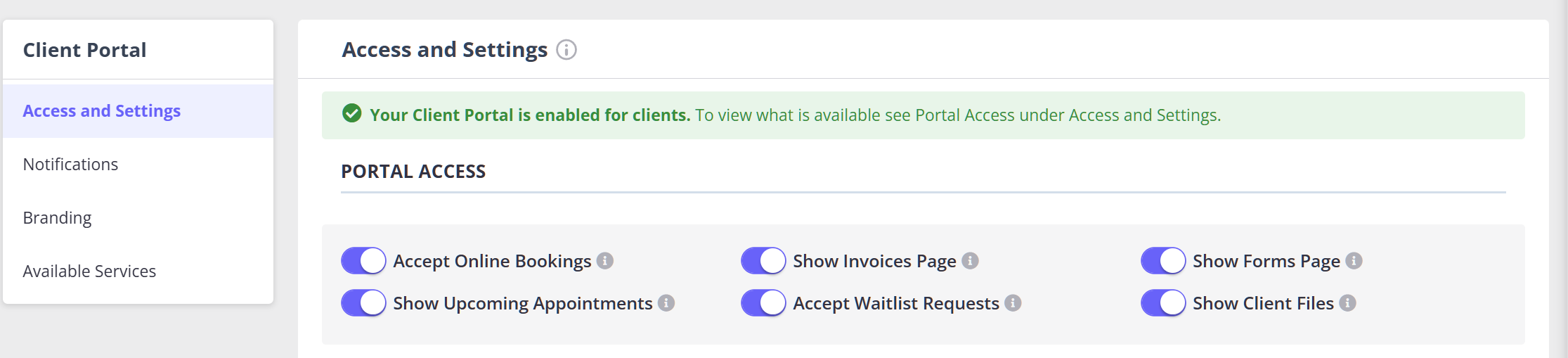 - Go to User Menu > Account Settings > Schedule > Client Portal > Access and Settings