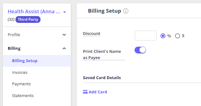 - In this third party profile, go to Billing > Billing Setup and enable the 'Print Client's Name as Payee'.