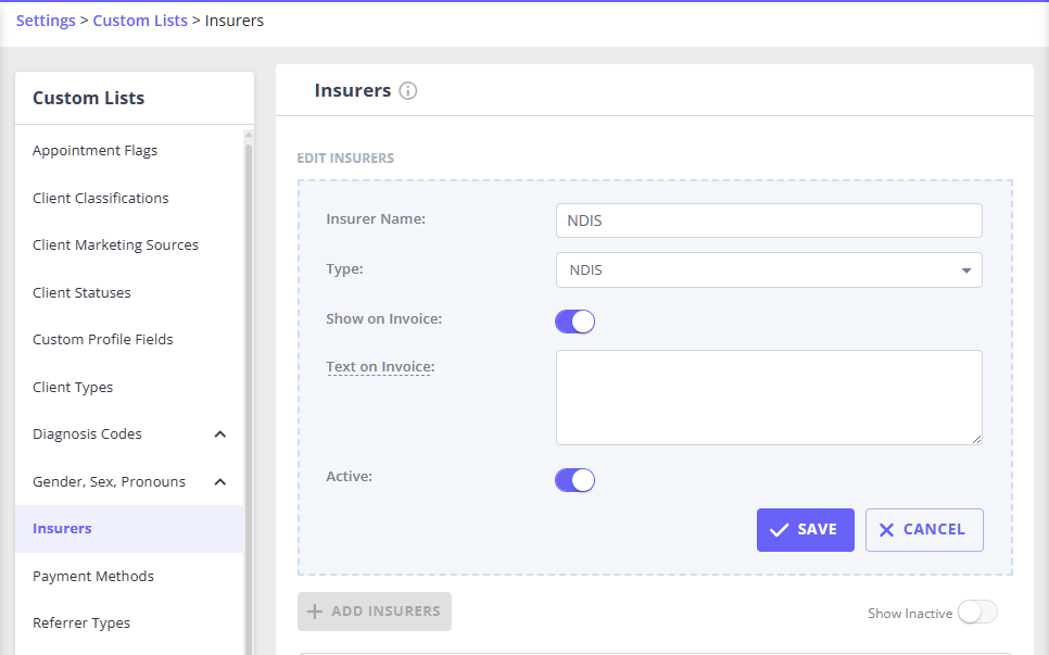 - Add the insurer name 'NDIS';
