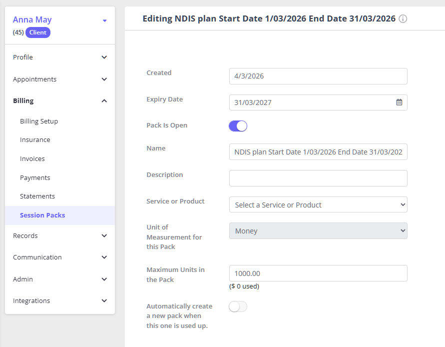 Select this Open Session Pack on the appointment panel (or the invoice) when billing the client/plan manager.