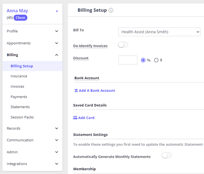 - Navigate to Client Profile > Billing > Billing Setup