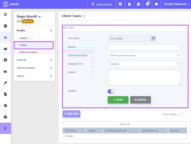 4. After selecting the name, add the other details and press the Save button. Your new referral will appear in the Referral List in the client’s profile.