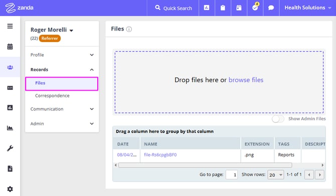 - The Files tab allows you to upload and organise all the files that were sent to you by this referrer.