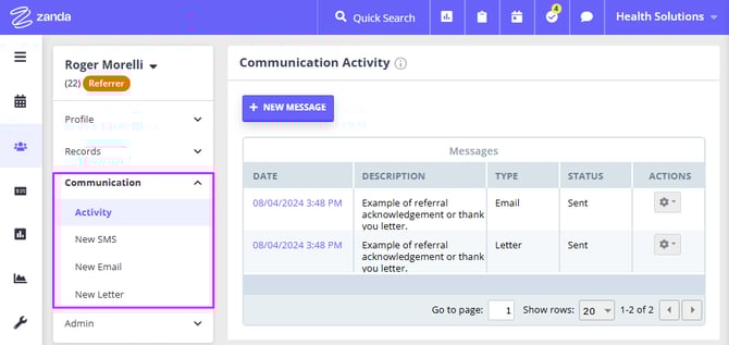 - manually generate and send a new SMS, email or letter with the help of Zanda Communication feature: