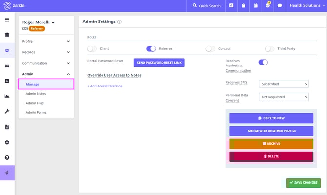 - On the Manage tab you will be able to add new Roles to the profile, reset their Client Portal password, manage their subscription to marketing communication, make a record of the personal data consent . The following manage options will help you to