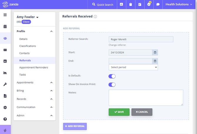In Zanda, you can keep track of your referrers and referrals. Using referrals allows you to add referring provider details to invoices, report on which referrers are making the most referrals to your business and more.
