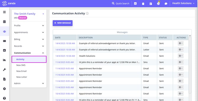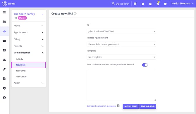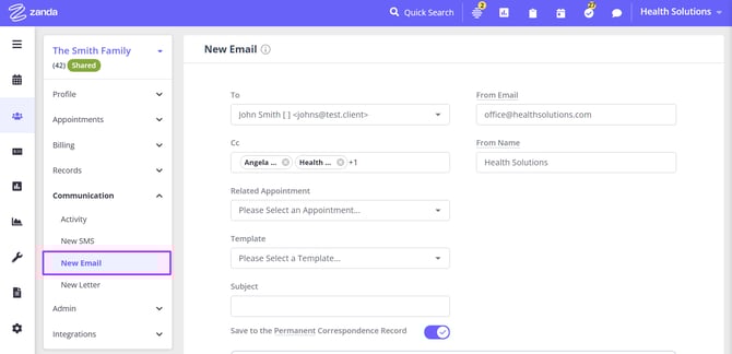 5. Use the Communication feature of the shared profile to send SMS, emails and generate letters. The primary member of the shared profile will be a default contact, and you will be able to CC communication to the other profile members.