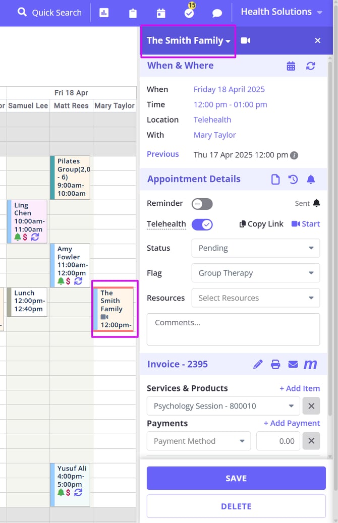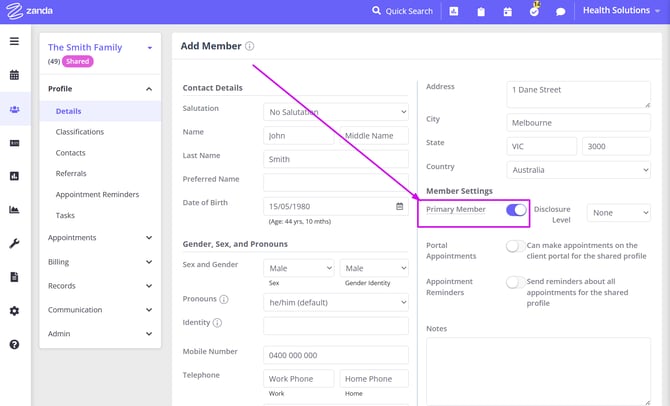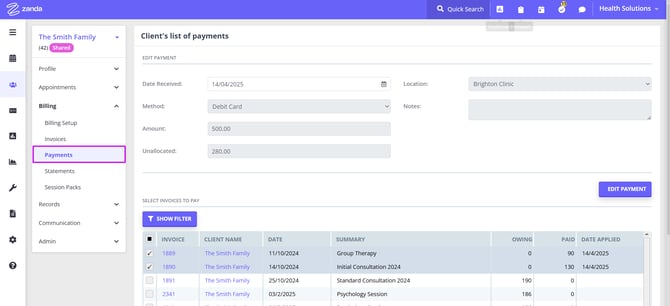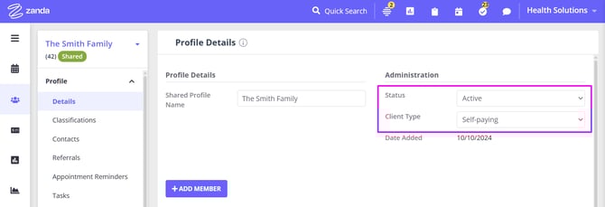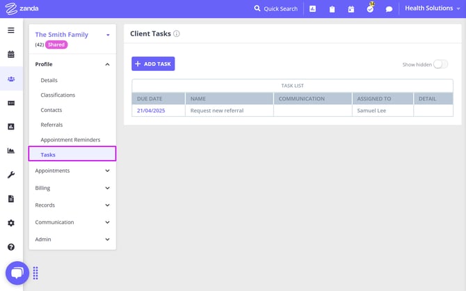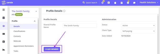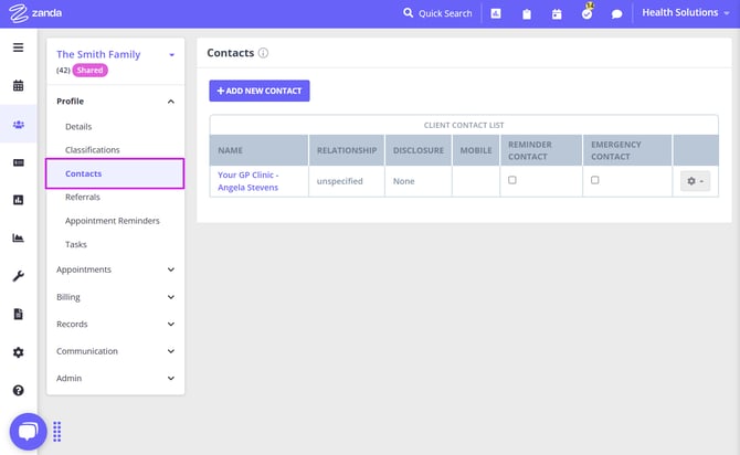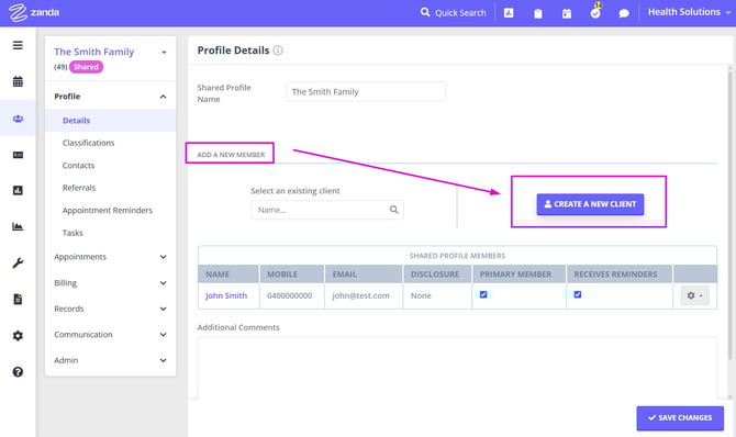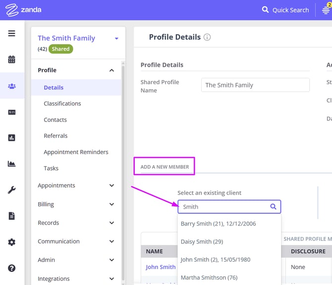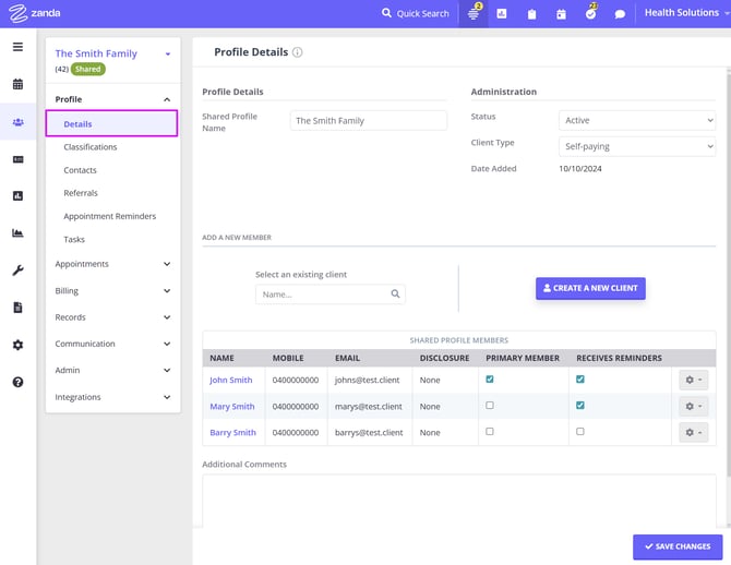 Creating and managing shared profiles in Zanda allows you to streamline appointments, invoicing, and record-keeping for couples or other shared treatments involving multiple clients. This feature is designed to simplify the process by consolidating important details into a single profile, making it easier to manage joint appointments, track payments, and keep comprehensive session notes for shared treatments. Whether you are coordinating care for families, couples, or groups, shared profiles offer a seamless way to handle all aspects of client management efficiently.
