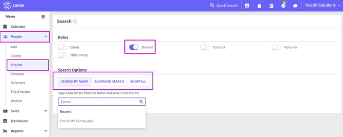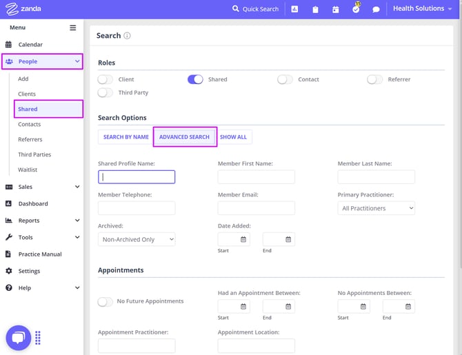 2. The Advanced Search feature will help you search for one or a list of shared profiles, filtered by shared profile members details, shared profiles appointments information and classifications.