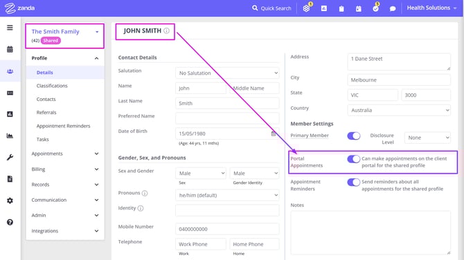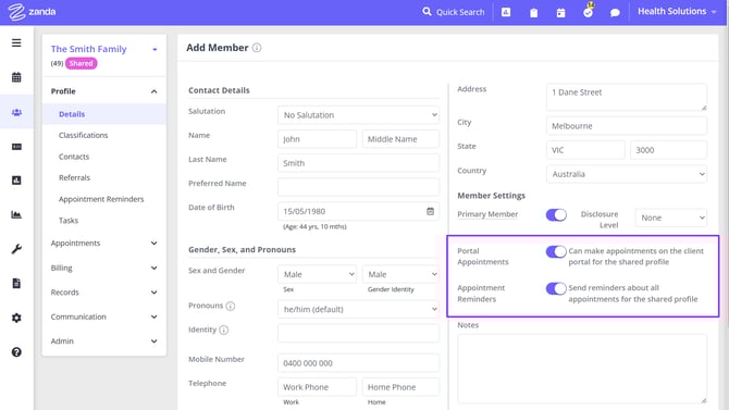 6. On the member settings, you will also be able to allow the member to make portal appointments on behalf of the shared profile, and receive appointment reminders for the shared profile. Appointment reminders will pick up the time zone set in the member profile when sending out reminders.