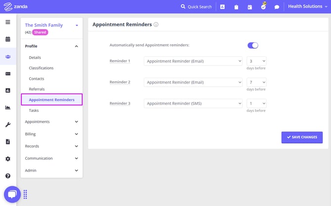 - The Appointments Reminders page lets you configure reminder settings specific to this shared profile, which will override the general automatic reminder settings of your account.