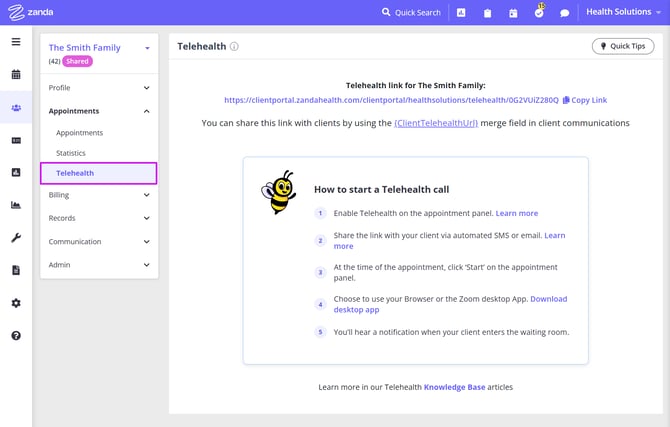 - Telehealth - contains this profile's unique Telehealth meetings link and instructions for practitioners how to start a Telehealth call.
