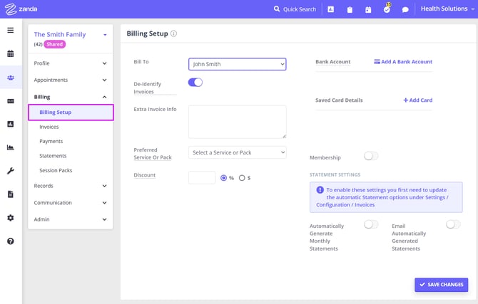 - Billing Setup - configure invoicing options & defaults.