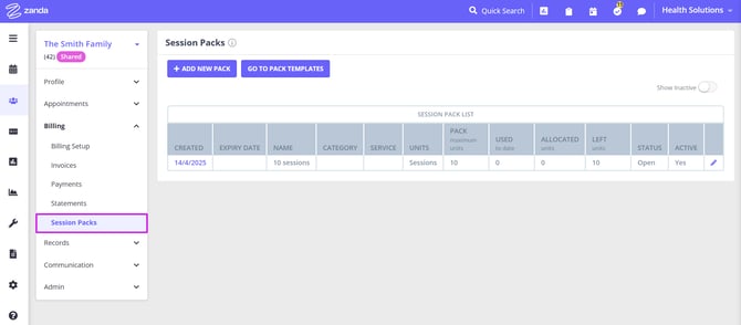 - Session Packs - review and edit all the current and expired session packs for this shared profile.