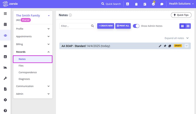 - Session notes - list of all clinical and admin notes created for this shared account. The notes created in the shared profile will be generated as records of the whole shared profile, not per a specific profile member.