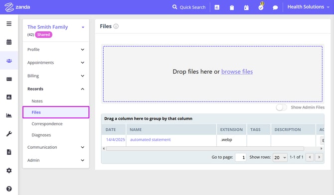 4. The Records folder records confidential information of the shared profile, including their session notes, file uploads, correspondence and diagnoses.