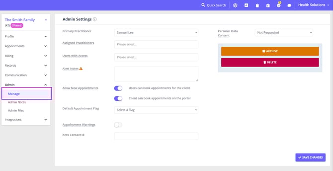 - Admin > Manage page allows you to record the personal data consent, archive and delete the shared profile. You can also use this page for additional appointment management: set appointment alert notes and warnings, a default appointment flag and block new appointments creation.