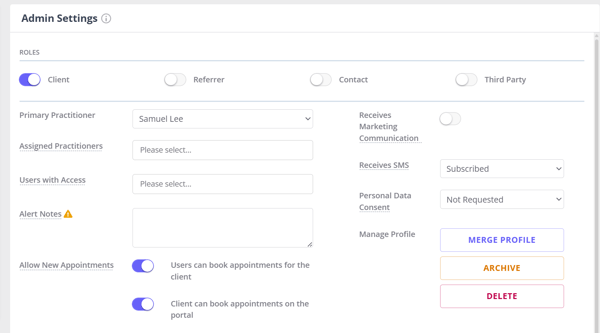 Duplicate client, contact, referrer and third party profiles can be merged together preventing the need to manually copy appointment and invoicing information. Please note that when a profile is merged the system is essentially deleting one of these records and moving data to the other, so it is not possible for this to be reversed with ease.