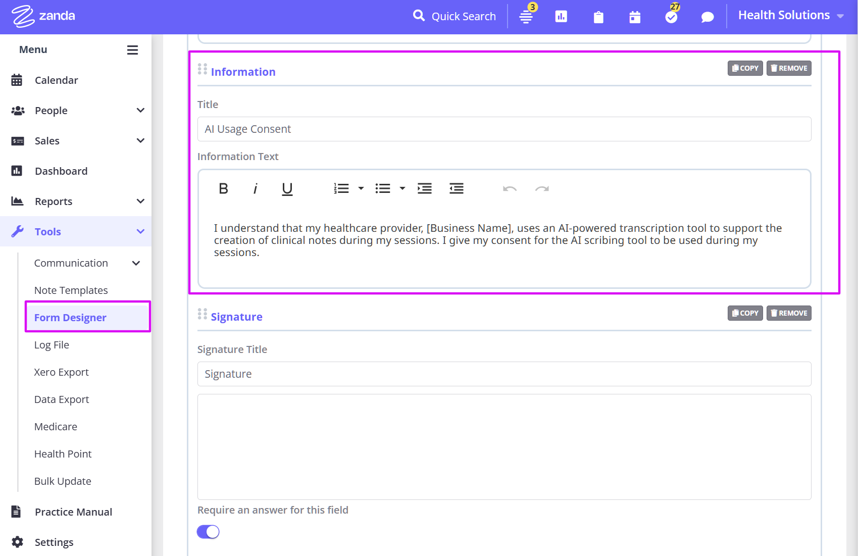 - Next, add a new Signature field. This is where clients will sign to provide the consent.