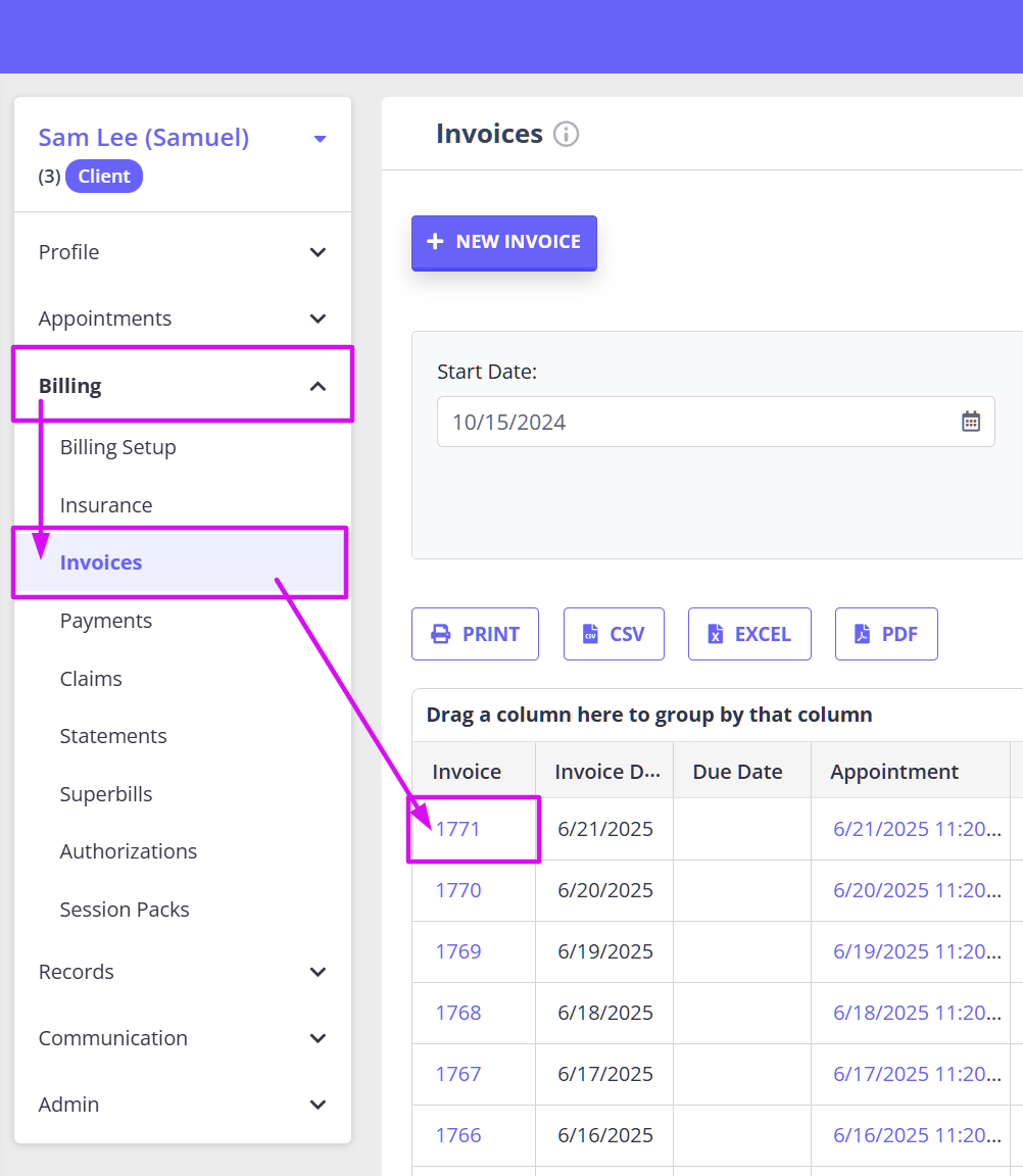 You can create the CMS-1500 and claiming form from an invoice edit page.
