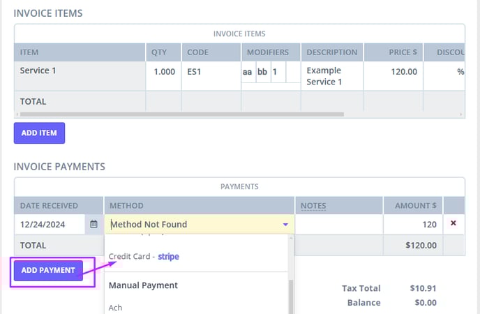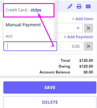 - Method two: Select the 'Credit Card - Stripe' payment method while at an invoice.