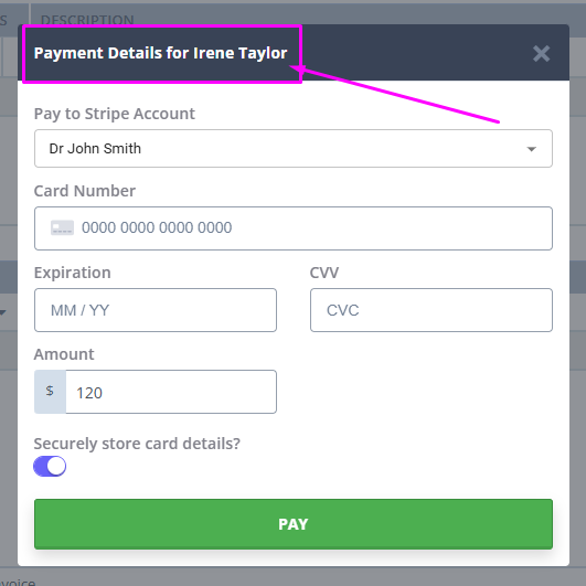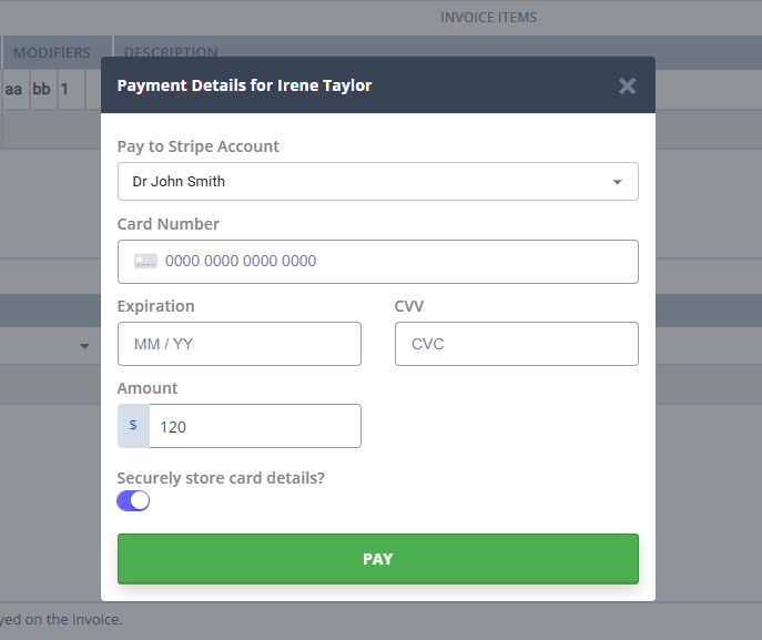 - If this is your first time taking a credit card payment from this client you will need to enter a Card Number, Expiration Date and CVC (Card Verification Code). For future transactions, the card details will then be stored by Stripe. Then simply click ' Pay' to process the payment. You'll get an immediate response advising if the payment was successful or not.