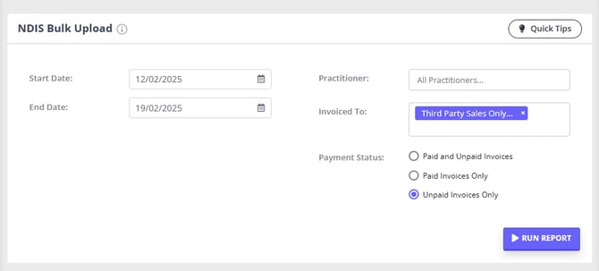 - The 'Payment Status' is set to 'Unpaid Invoices Only' by default to pick up the invoices that still need to be paid by the NDIA.