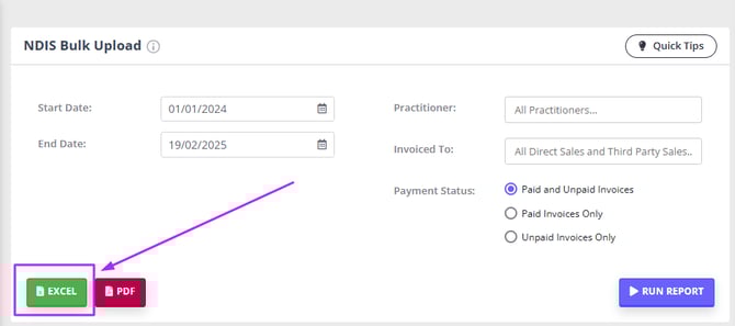 3. When the report is ready, click on the ' EXCEL' button on the left to export the report and download it as a CSV file to be uploaded via the NDIS myplace portal.