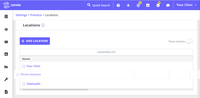 You can now easily control the order your locations appear across Zanda using a simple drag-and-drop interface on the Locations page. This enhancement helps keep location pickers consistent throughout the system—such as in the calendar, appointment panel, and reports—while allowing you to prioritise the locations your team uses most often.