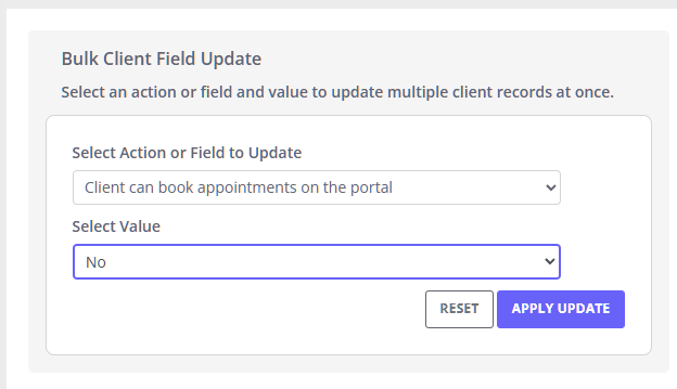 ✅ The Bulk Update tool now supports updating Client Type and key booking permissions, including whether users can book appointments for a client and whether the client can book appointments through the Client Portal.