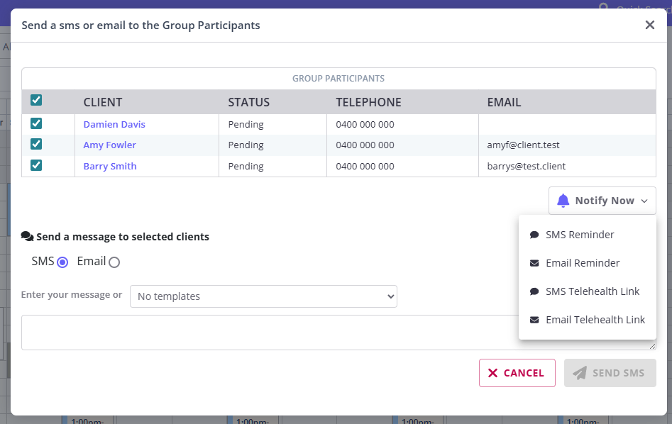 We added the new Notify Now option so you can send SMS or email reminders, or a unique telehealth link to selected or all group appointment participants in just a few clicks.