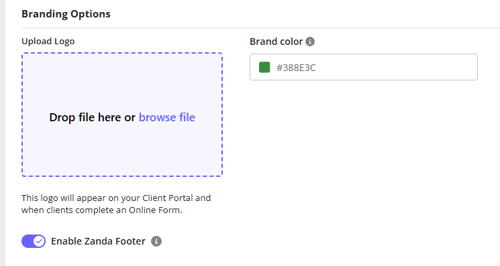 We added a switch you can use to turn on/off the Zanda branding on the footer of your new client portal. When off, it will remove the Zanda logo and slogan.