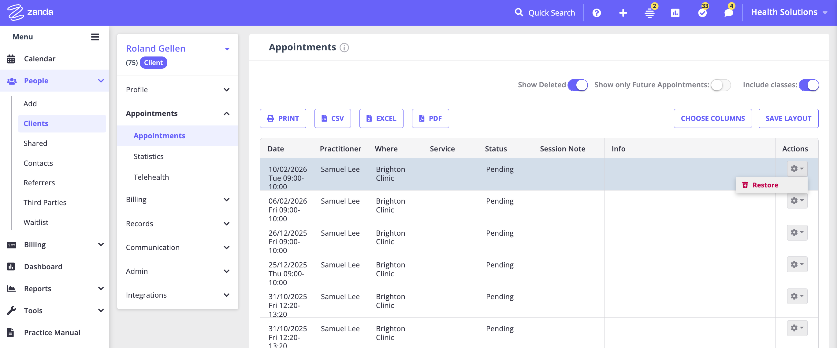 Restoring a deleted appointment from the Client Profile