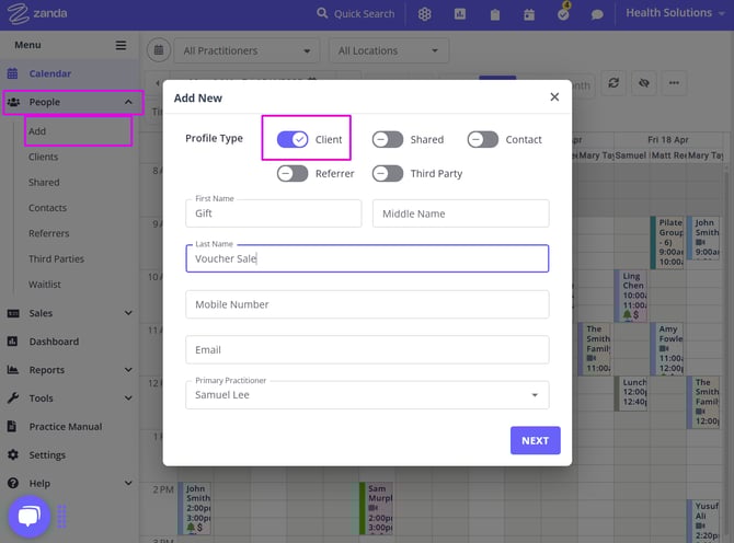 3. In People > Add, create a new Client Profile. Name it 'Gift Voucher Sale'. You will use this client profile to make a record of a sale to a walk-in client.