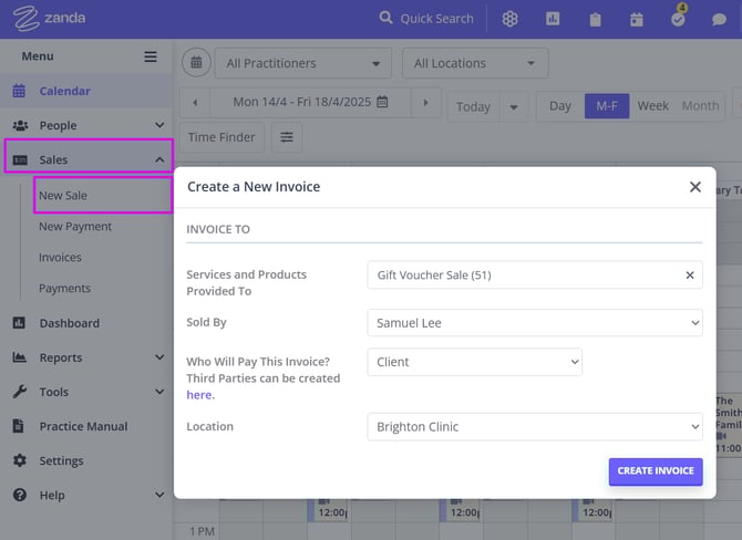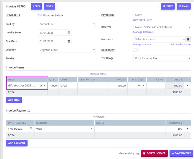 - for a walk-in sale, select the Gift Voucher Sale client profile in the 'Services and Products Provided To'