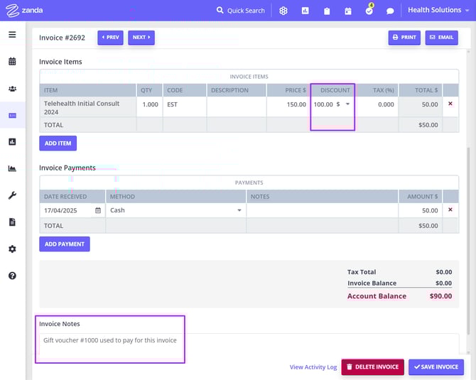 - In the Invoice Note field, add a note that a gift voucher was redeemed for this service. Save the changes.