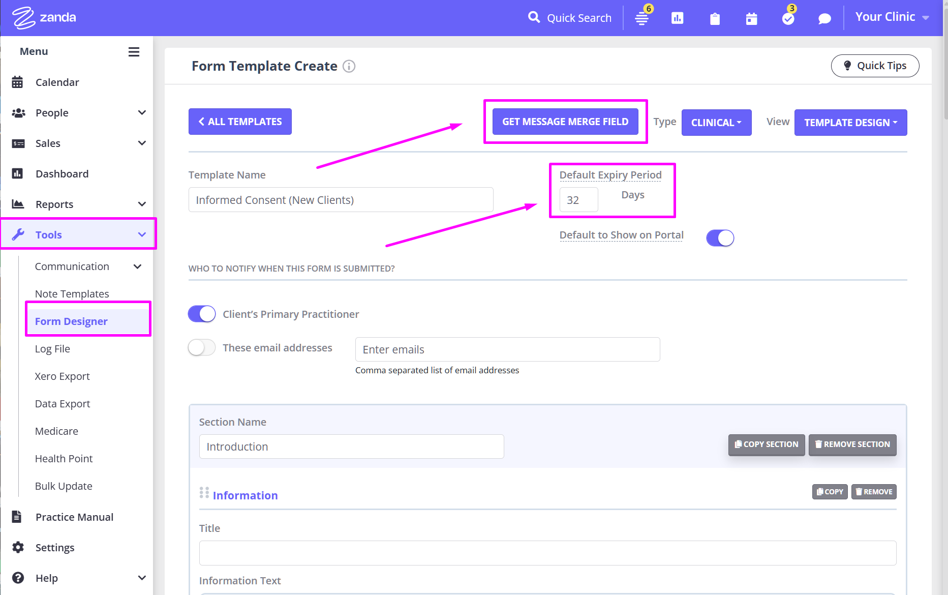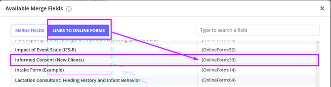 - Each online form template you'll add or create in your Zanda account will have its own merge field which you'll be able to use to embed in your communication templates. You can copy it from a template directly, but it is not necessary.