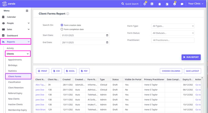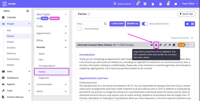 You can click the link in the Actions column to jump straight into a client’s Forms page.