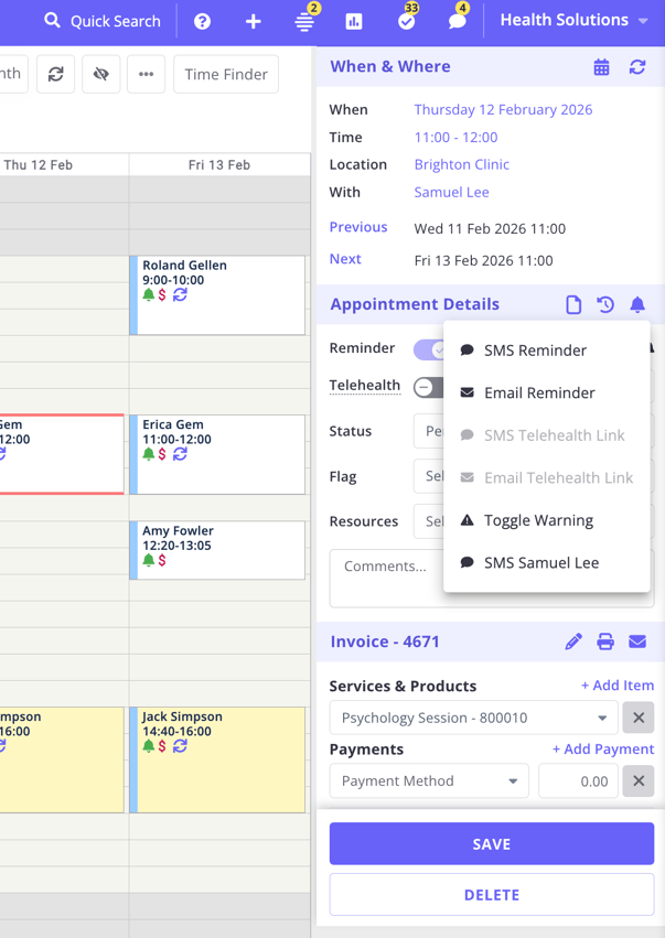 - In the pop-up menu, click on either Email Appointment Reminder or SMS Appointment Reminder to manually send the reminder to your client.