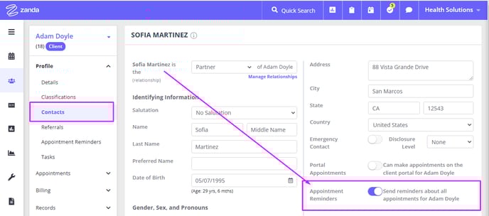 Send appointment reminders to a client's contacts such as a parent or partner.