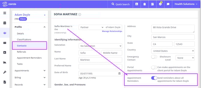 Send appointment reminders to a client's contacts such as a parent or partner.