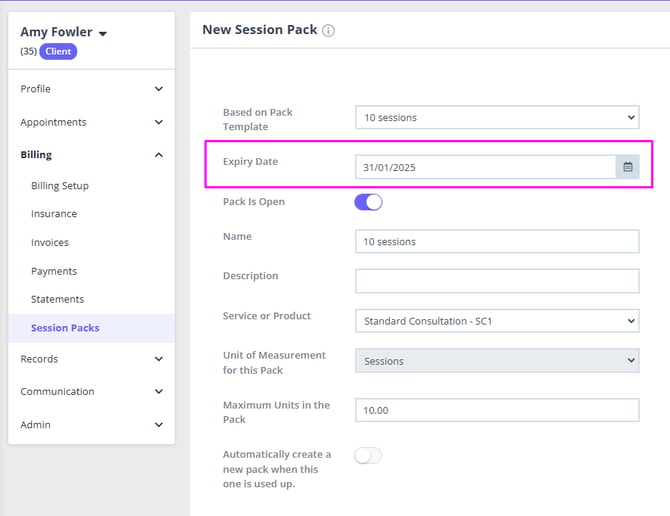 - In Client Profile → Billing → Session Packs, open an existing pack or create a new one from one of the available templates.
