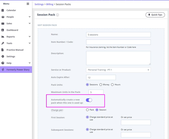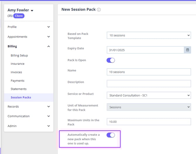 When necessary, Session Packs can be auto-created by the system, when the previously assigned client pack is used up. Again, this can be set up on the Session Packs Template level, or for an individual session pack of a client.
