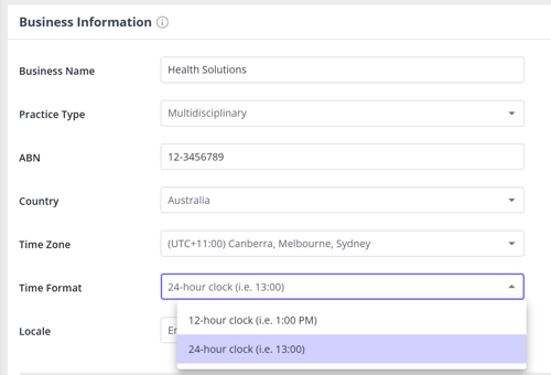 You can now choose whether you want 12 or 24-hour time for the account. To do so, you need to navigate to User Menu > Account Settings > Practice > Business Info and select the Time Format with the options of