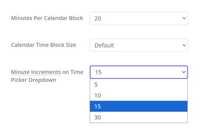 With the new setup, you can choose the default minute increments available in the time drop-down lists throughout the account. Previously, the time selector defaulted to 5-minute increments. You can now select between 5, 10, 15, and 30 min increments to suit your needs.