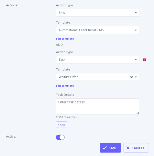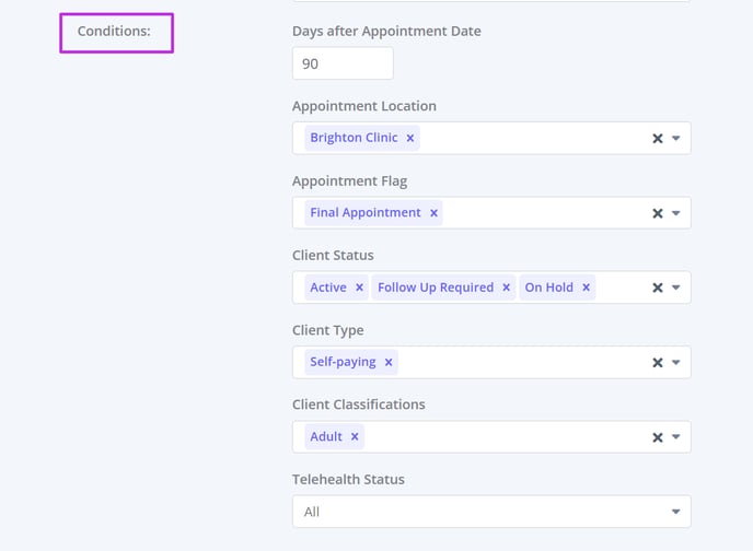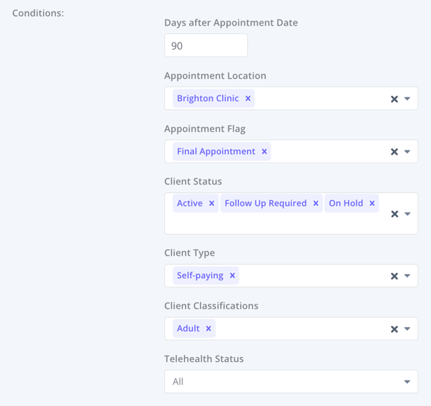 Across different conditions (e.g. Days after Appointment + Client Status + Telehealth Status), the system applies AND logic. Example: The automation will trigger only if the last appointment was 90 days ago AND the Client Status is Active AND Telehealth Status is Enabled.