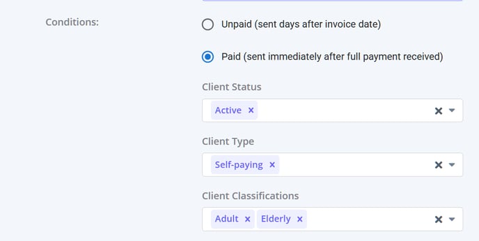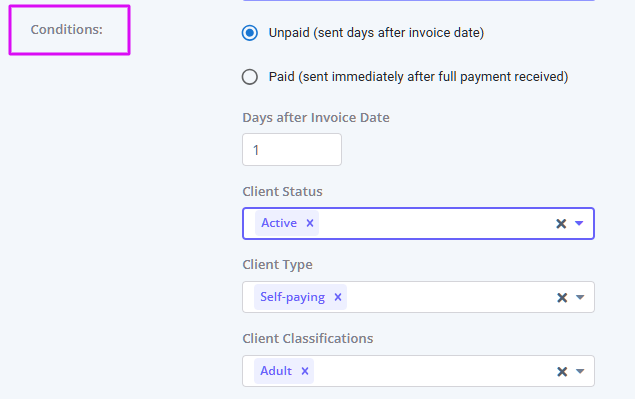 Between different conditions (for example, Invoice Status + Client Type + Client Classification), the system uses AND logic. This means all conditions must be true at the same time. Example: The automation will trigger only if the invoice is Unpaid AND the Client Type is Self-Paying AND the Client Classification is Adult.