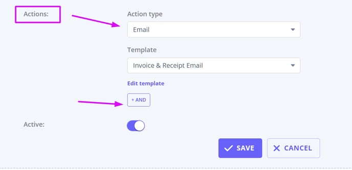 - You can add another action by clicking the '+AND' button and selecting an action then template. You can add as many additional actions as needed.